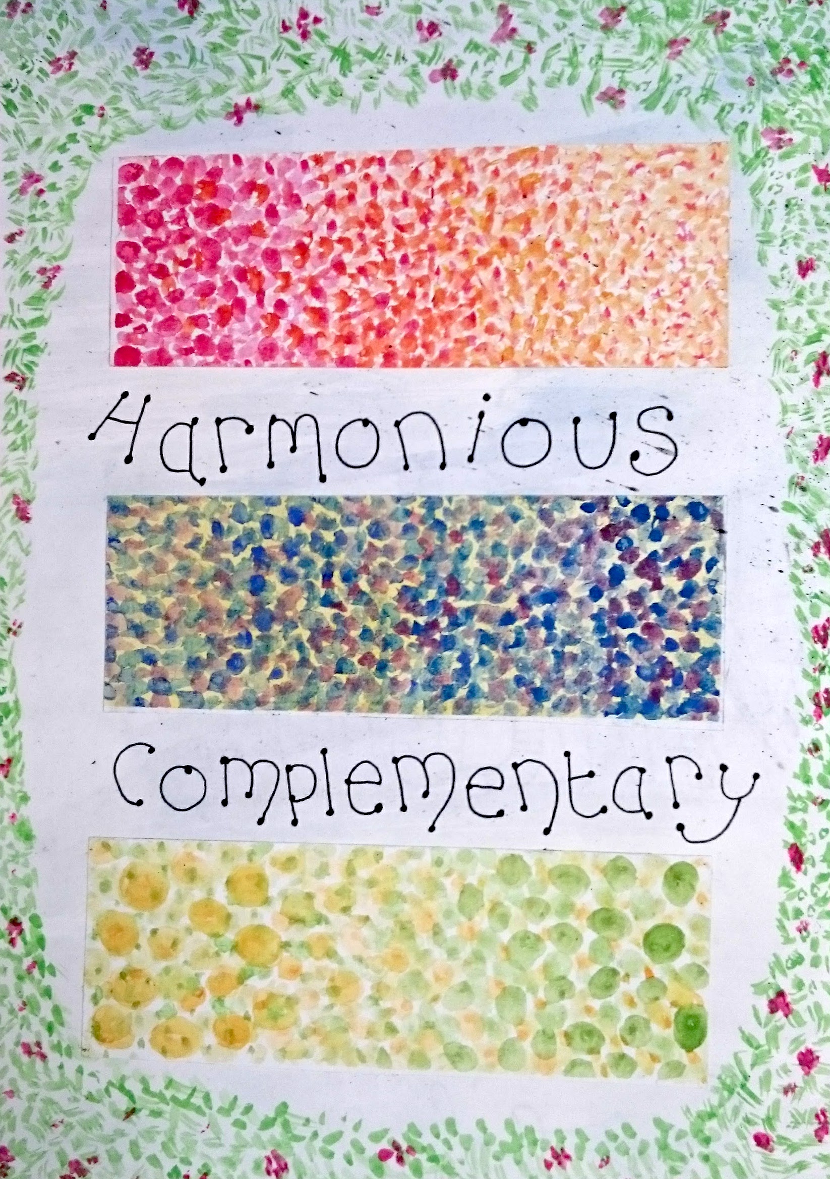 - one painting over a light washed background with a contrasting colour (using different size and shaped brushes to create daubs rather than dots)