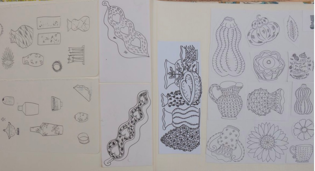 You can see some of Kate Malone’s sketchbooks online. They show how Malone looks at objects carefully, studying their shapes and forms, then draws her designs to work out her ideas. The sketchbooks include lots of rough sketches and swatches, or samples, of colours, textures and other inspiration for her artworks. Looking at her drawings, you can easily see which natural forms she has been inspired by.