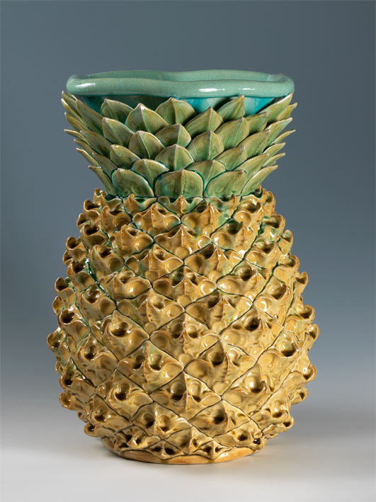 What words could you use to describe the pineapple sculpture? Try to think of 5 different words.