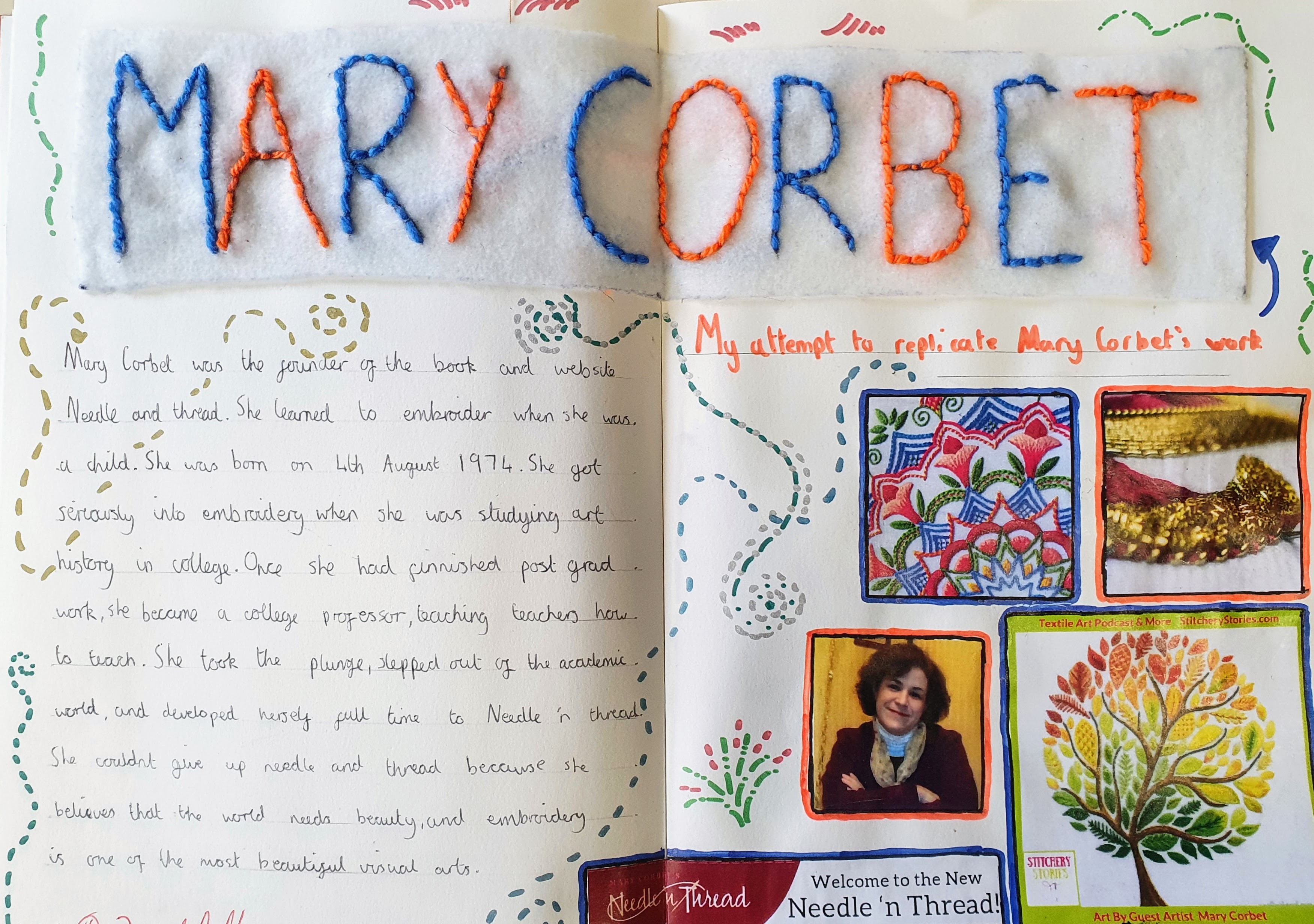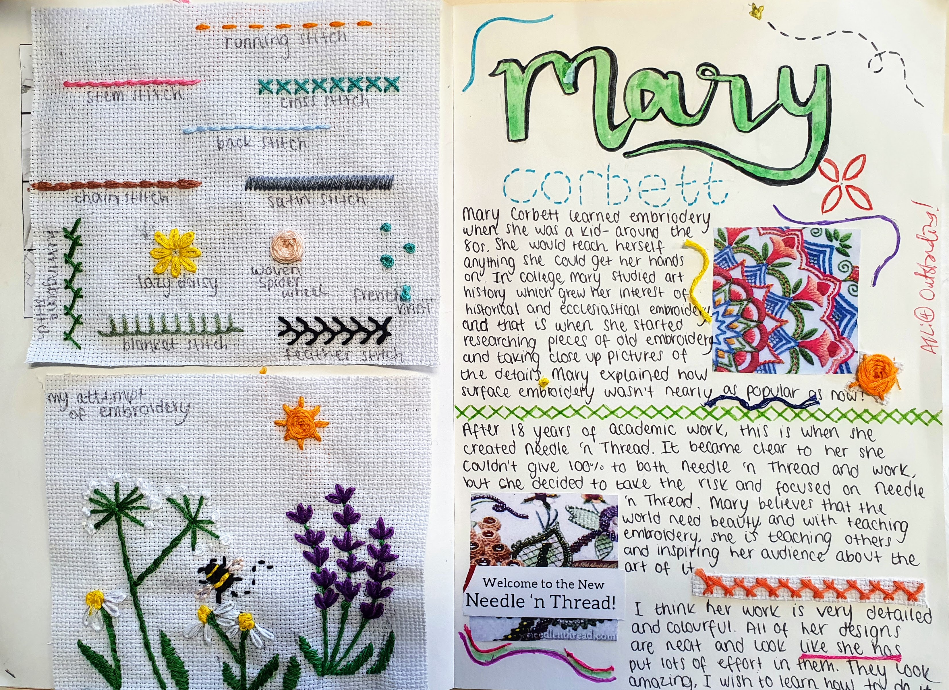To start their project, students were introduced to the hand-embroidery work of Mary Corbett. Her textiles website Needle N Thread is such a great resource – it has lots of examples of textile art and the videos are perfect for students – I regularly used them. Students were asked to create artist research pages and have a look at her website for inspiration; I could tell they were inspired because some of their sketchbook pages were stunning: