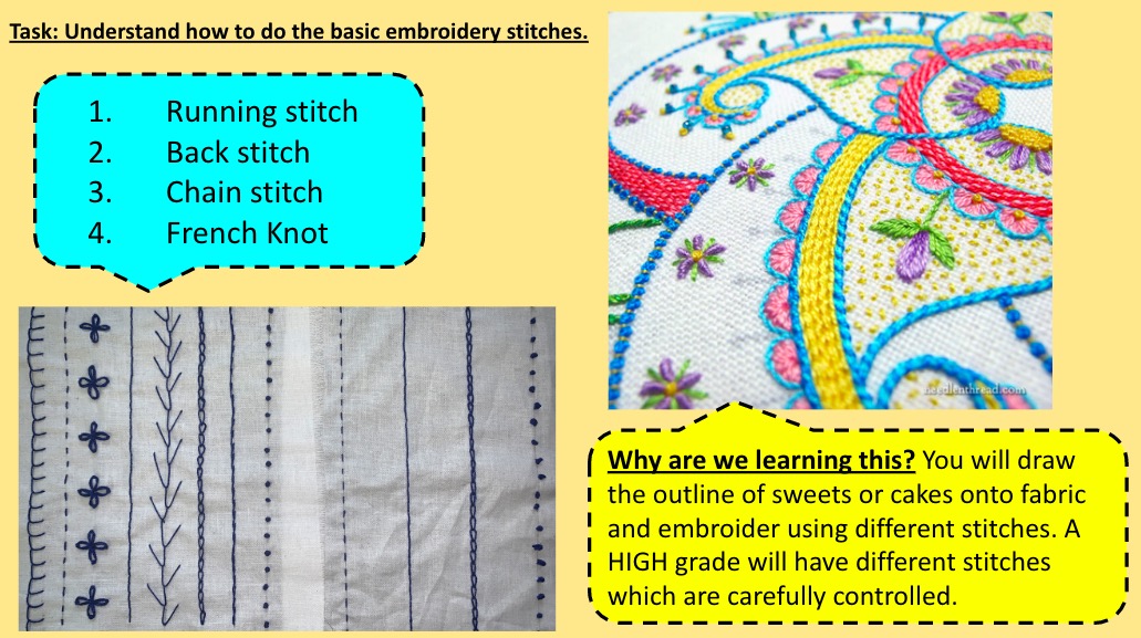 The eagle-eyed amongst you might have spotted a few types of stitches that were not included in the earlier slides. Some students were given extension tasks and challenges to add a wider variety of stitches as they were confident using the ones I had taught in class. I found some great PDF booklets online that I printed and gave out – these are included in the presentation too.