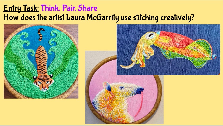 Essentially, this embroidery project goes backwards and forwards as such: practise stitching and build confidence on the scrap fabric, then apply new stitching skills on the final design. I have included a full range of lesson starters / warm up activities / bell ringers / entry tasks / plenaries / reflections etc. and they are all included in the presentation.