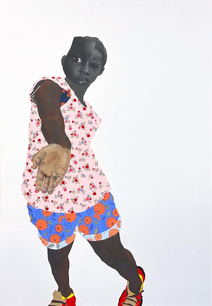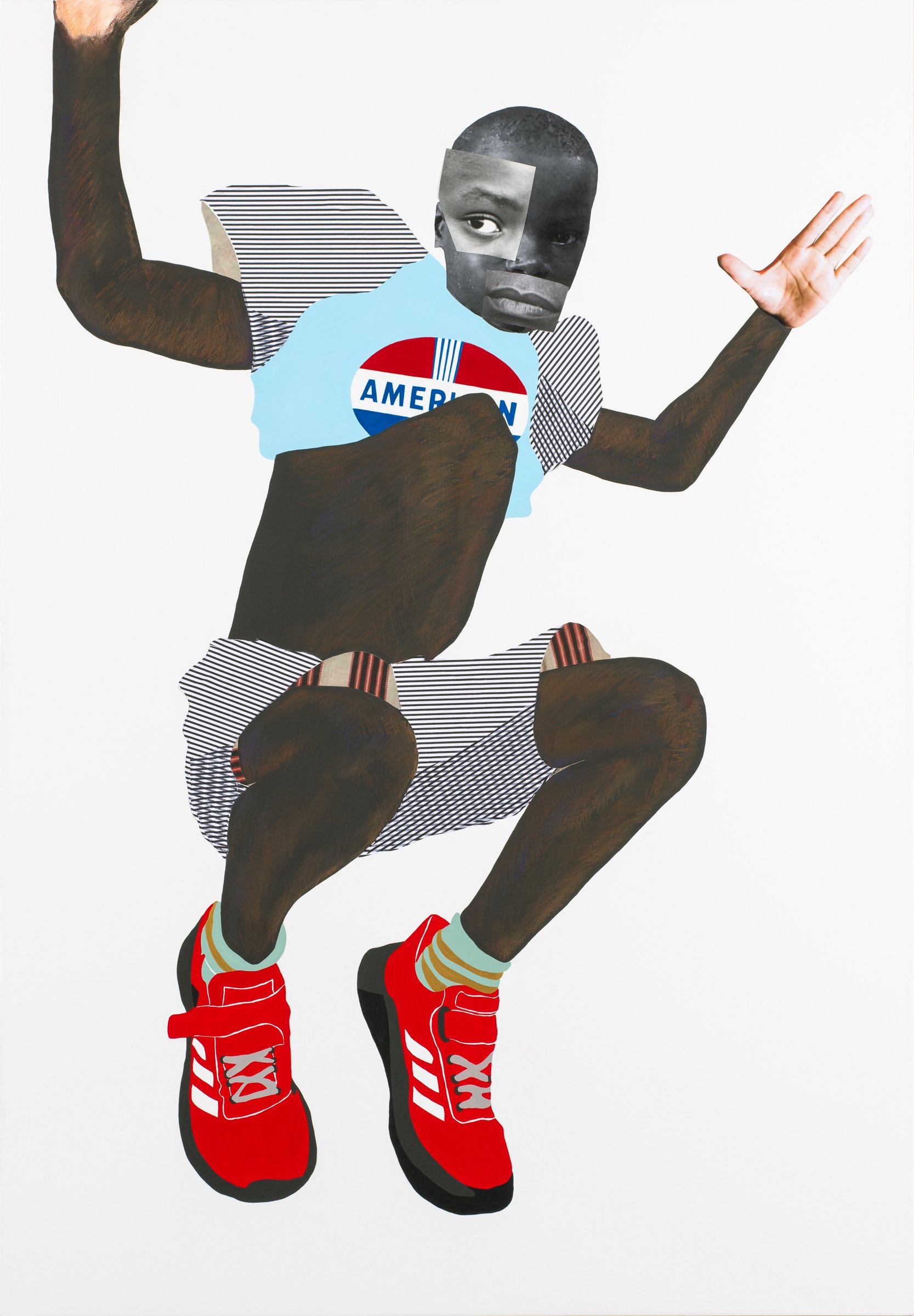 Look at the piece, Jamal (2020), above. Can you think of 5 adjectives to describe the artwork? Which parts do you think have been made with collage, and which have been painted?