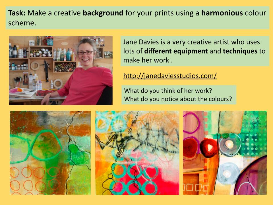 Next, students did some artist research to understand different ways of creating interesting backgrounds to print onto – we looked at collage / multimedia artist Jane Davies for inspiration. This was a really fun part of this printing project, as students used a range of materials such as sponges, straws, forks, spatulas etc. Pupils worked in their chosen colour scheme.