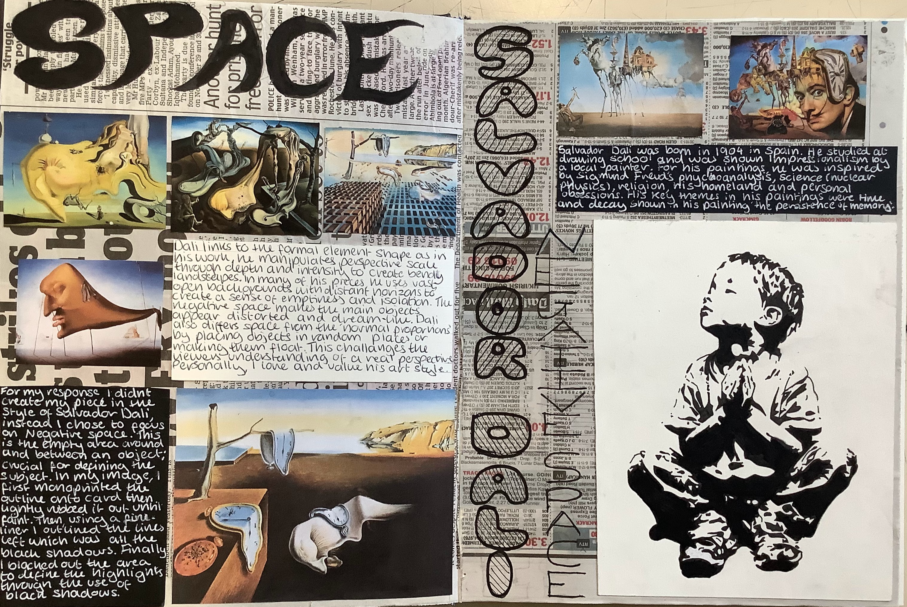 Space is the area around, between, or within elements in a composition (layout). Artists use techniques like perspective and overlapping to create a sense of depth and space in their work. Some artists focus on the negative space of a subject.
